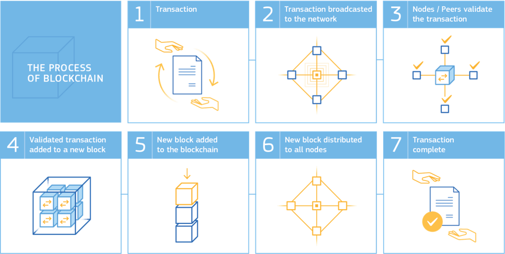 Technically, blockchain can be defined as a distributed and decentralized database where all transactions are verified by a distributed system based on a P2P network architecture[2]. This distributed system operates and regulates itself through cryptographic algorithms. At its simplest, blockchain can be understood as a chain of blocks of information[3] that relies on encryption and immutability (those two images play a central role when talking about blockchain and explaining how it works).